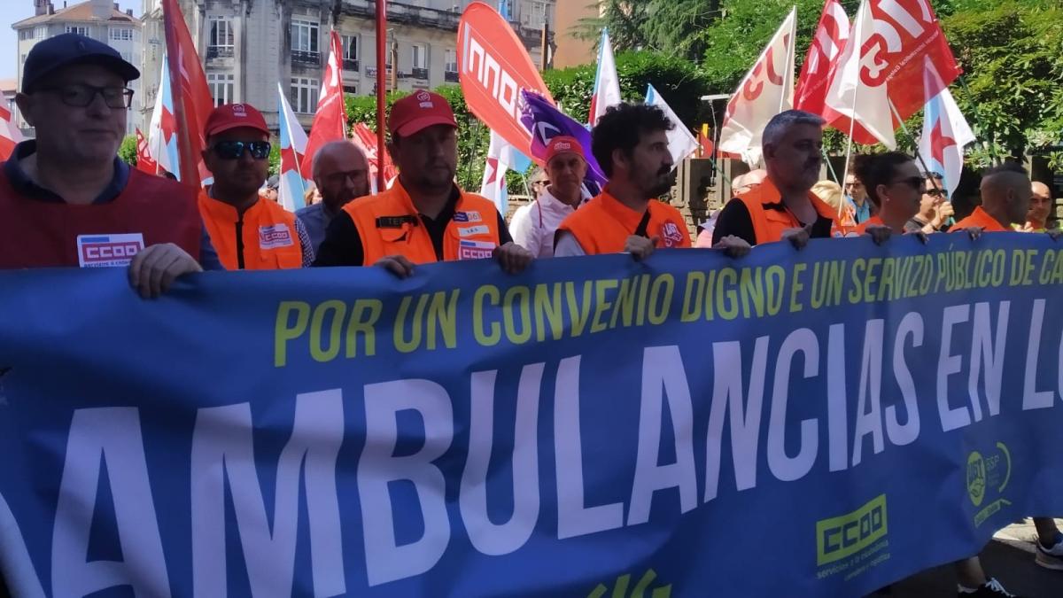 Traballadoras e traballadores do sector das ambulancias, convocados por CCOO, UGT, CIG e USO, manifestáronse este xoves en Santiago de Compostela para esixir un convenio xusto. A decisión de mobilizarse adoptouse tras rematar sen acordo a sétima reunión para negociar o convenio colectivo autonómico.